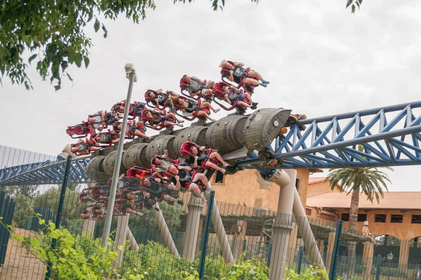 Furius Baco is PortAventura’s high-velocity launch coaster, a tongue-in-cheek vineyard experiment gone wild that propels riders from calm to chaos in seconds—Mediterranean setting, kinetic humor, and a full-throttle visual narrative.